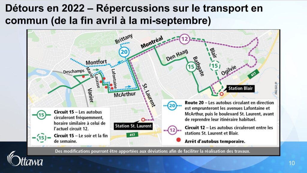 - La fermeture de voies entraînera des répercussions sur la circulation et le transport en commun dans le secteur. Une déviation temporaire des circuits d’autobus d’OC Transpo sera nécessaire pour maintenir le service dans la collectivité.