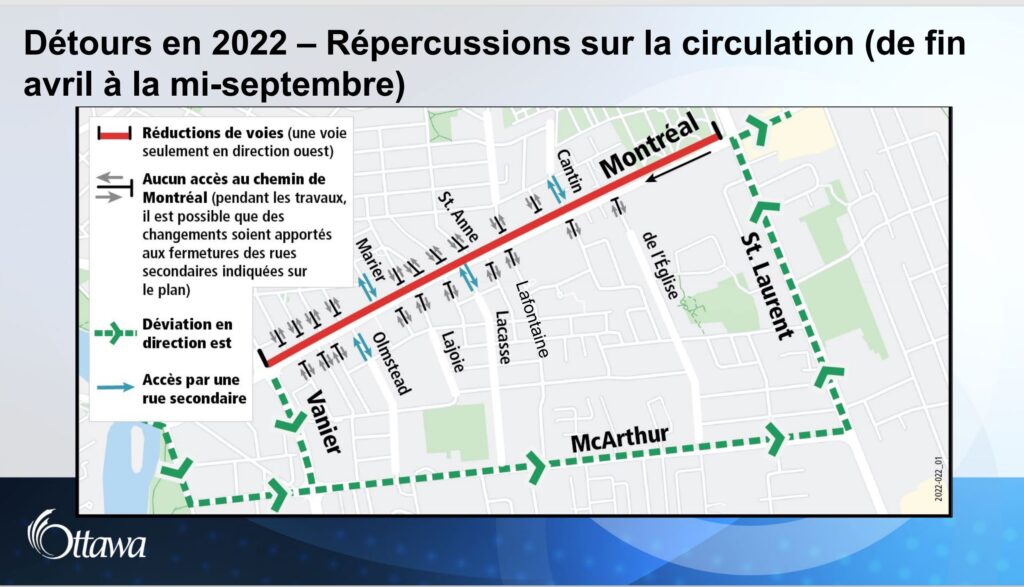 - Le chemin Montréal sera réduit à une seule voie en direction ouest jusqu’à la mi-septembre 2022 environ entre le boulevard St-Laurent et la promenade Vanier.