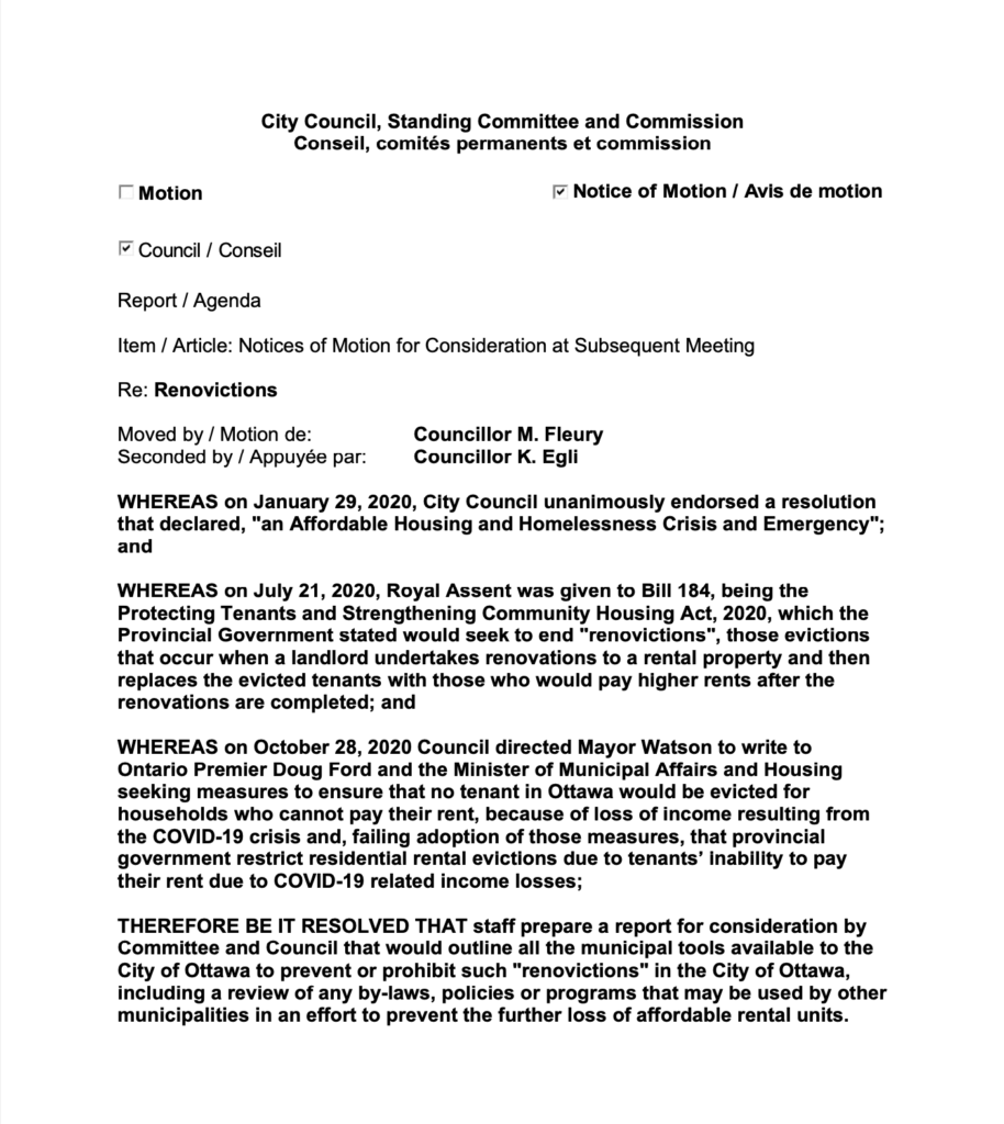 Further to the existing tools that exist for the City of Ottawa to advance by laws to protect renovictions from happening, the City will request the Province of Ontario address the Residential Tenancies Act and other relevant legislation to review opportunities to prevent and prohibit renovictions.